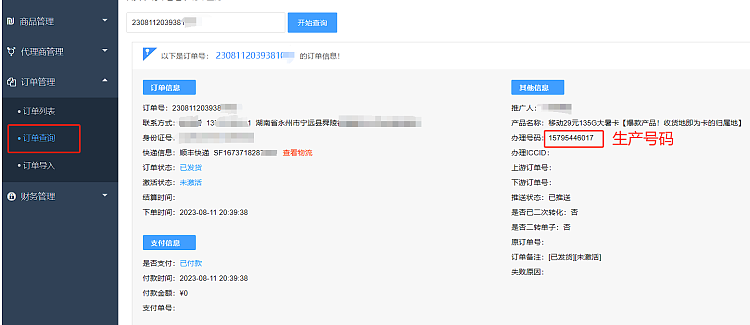 将订单号复制到“订单查询”里,可查看客户生产的手机号码