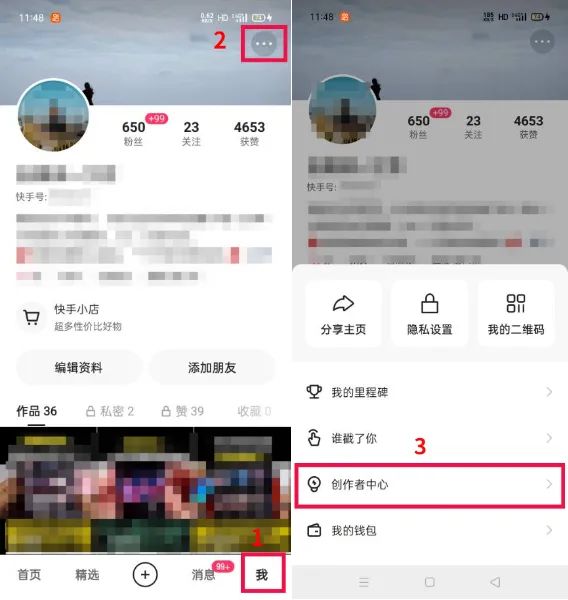 首先,打开【快手APP】-“我”-右上角“三个点”-【创作者中心】,操作如下: