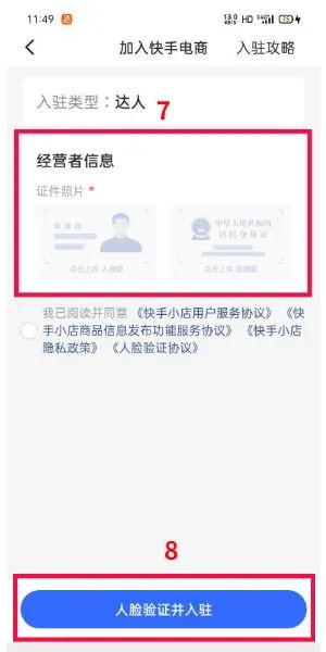 最后,在经营者信息栏,上传身份证正反面照片,并打勾,点击【人脸验证并入驻】,即可提交申请,等待审核。操作如下: