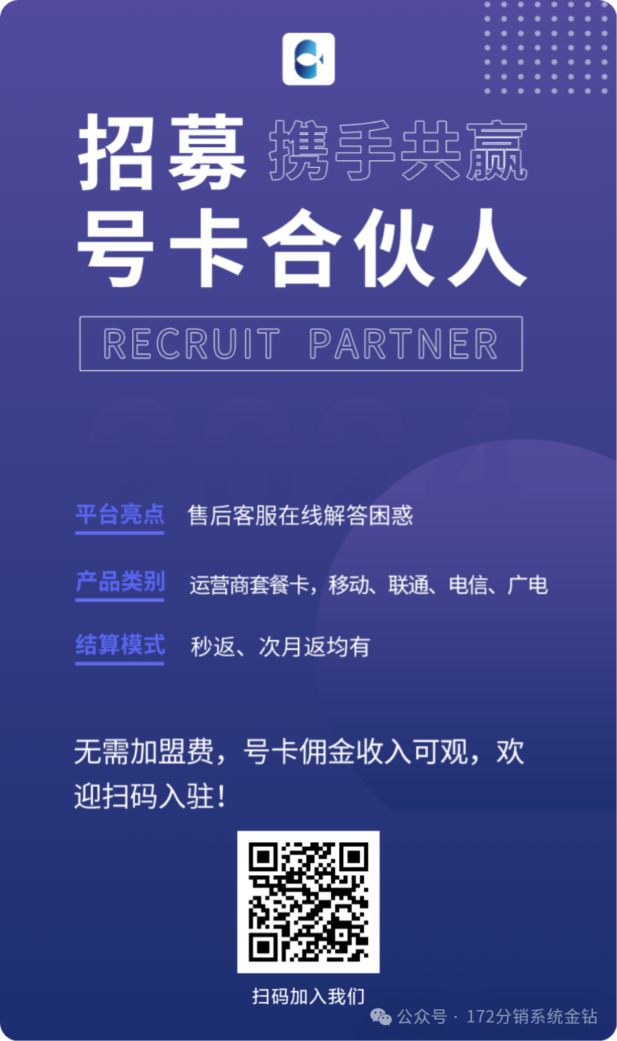 除了各类流量神器,我们还提供丰富多样的号卡套餐,满足你全方位的通信需求。从经济实惠的入门套餐,到高端商务的尊享套餐,应有尽有。一位刚步入大学的小李同学,以往使用家乡的号卡,异地通话费用高,流量套餐又贵又少,每月通信支出让生活费捉襟见肘。换上我们的大流量卡后,每月费用大幅降低,流量充足,还能与新同学畅快交流,迅速融入大学生活。 每一款都独具匠心,精准满足不同用户群体、不同使用场景的需求。而现在,我们正面向全国,火热招募172号卡一级代理商,携手共创财富未来。扫码下面二维码,注册后台!