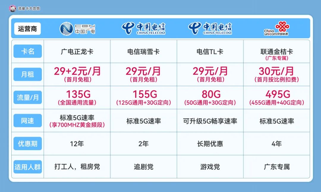 即使同价位也会分别有不同倾向的套餐,对于有办卡需求的朋友们来说,怎么挑,怎么选,可能会是一件比较纠结的事情,加上每个月,各家运营商可能都会推出几款新卡,也可能你上个月还很钟意的卡品,到了这个月反而又不是最优选了。