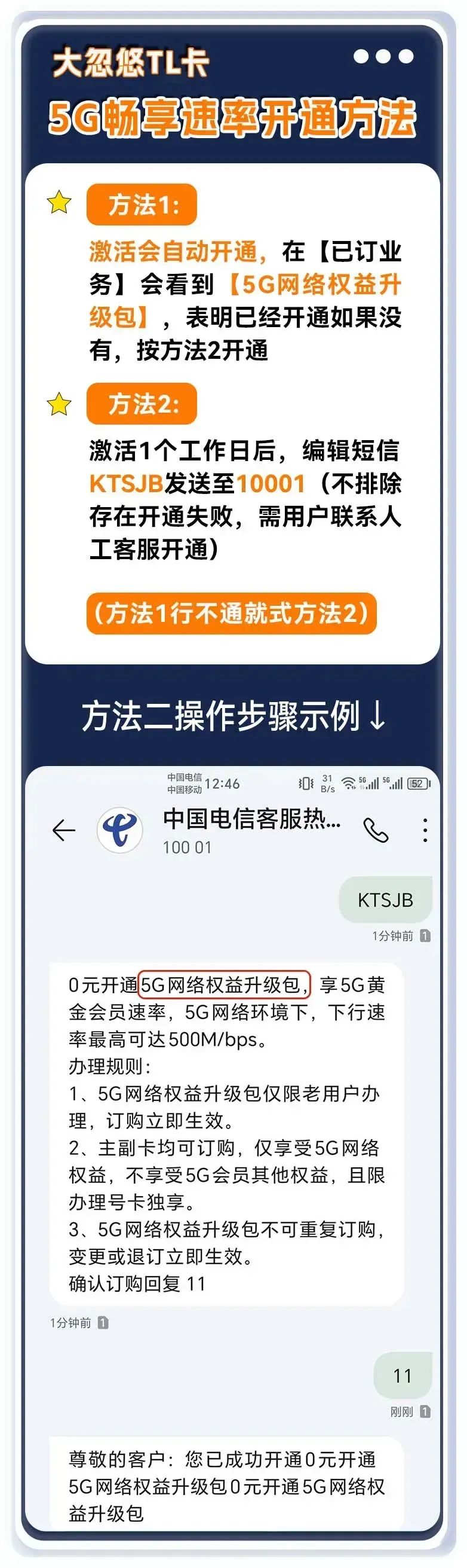 🔹在网3个月后,在电信短信专属链接内充值30元话费,就赠送70G通用流量,有效期2年,到期自动续订