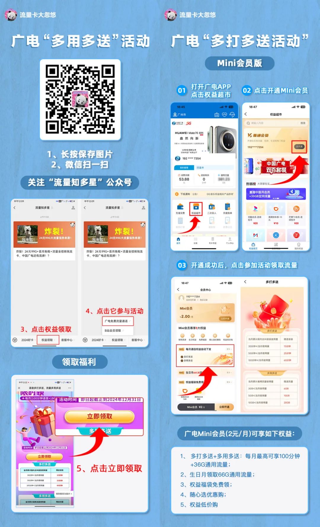 升级版“多用多送”活动:多加2块开通MINI会员后,参加升级版“多用多送”活动,还能多领36G流量;