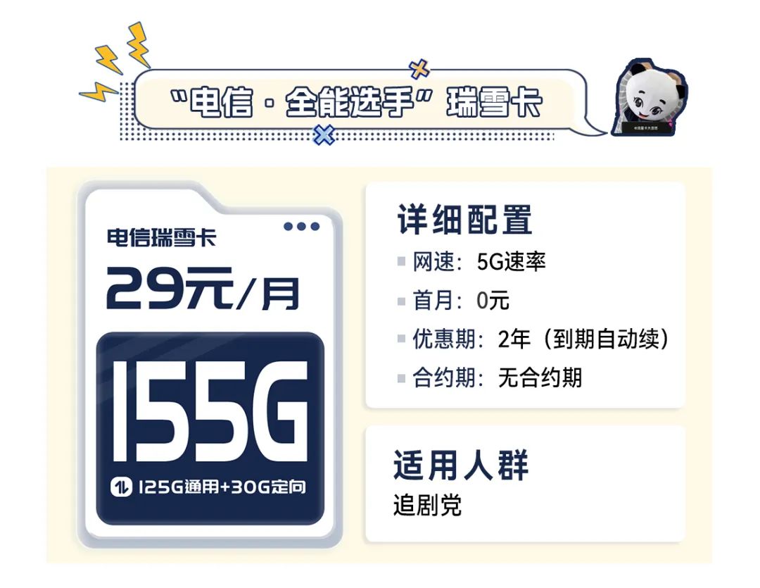 瑞雪卡套餐是29元155G,一张卡就能顶两张移动流量卡的总和,相当于直接省了一半的钱,一张卡用出两张流量卡效果。