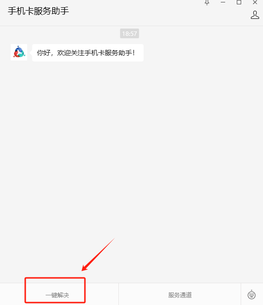 2、进入公众号后,在主页菜单栏位置,点击【一键解决】,直接跳转至小程序,进行复机、注销、补换卡、携号转网等操作