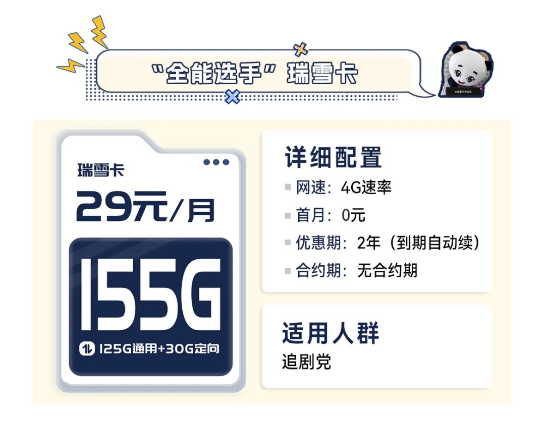 瑞雪卡套餐是29元155G,一张卡就能顶两张移动流量卡的总和,相当于直接省了一半的钱,一张卡用出两张流量卡效果。