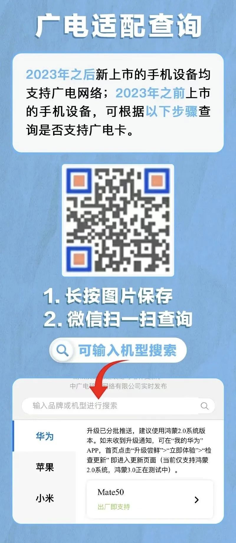 2023年前上市设备需查询是否支持广电网络,2023年后上市终端支持广电网络。