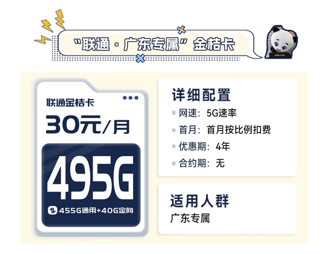月租30元,495G流量(55G全国通用+40G广东省内定向+400G广东省内通用)+100分钟免费通话全额到账;