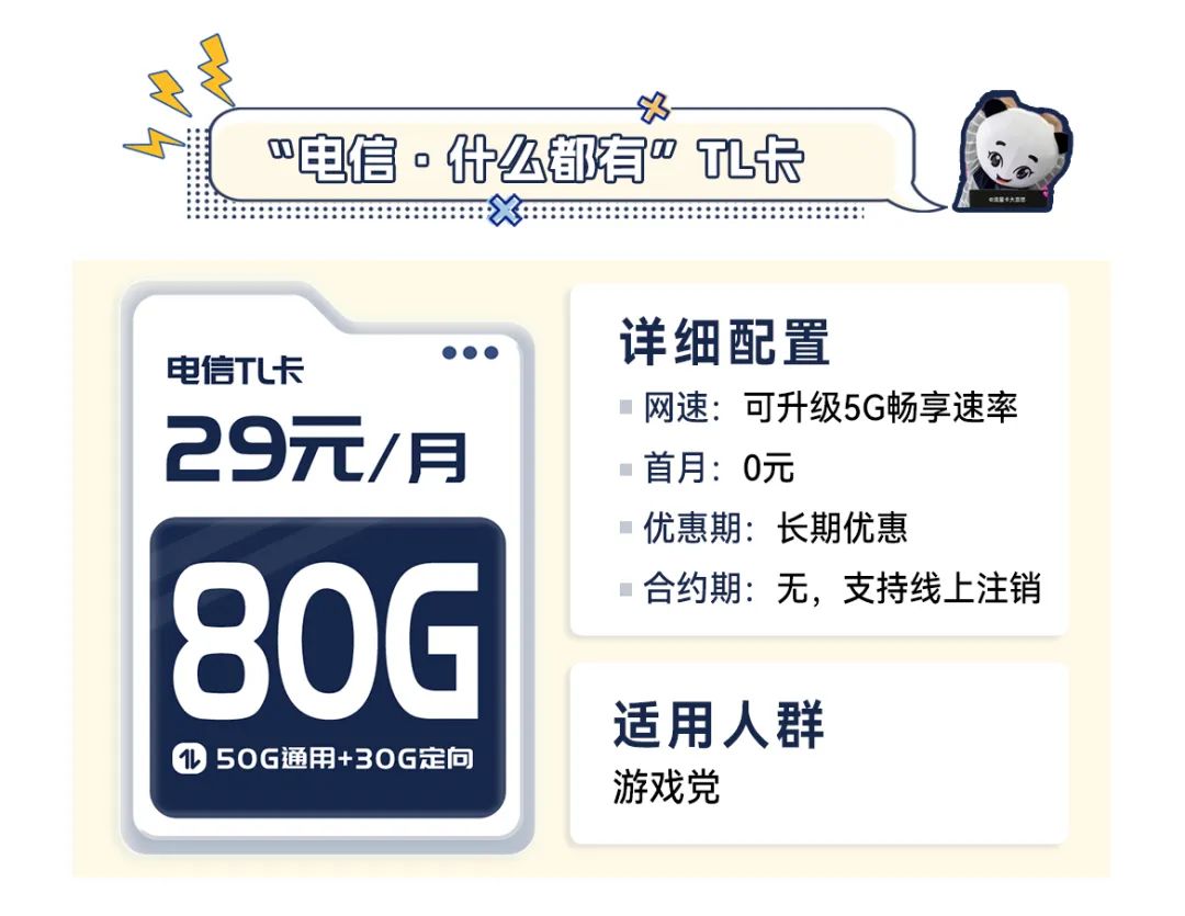 • 29元月租,每月到账流量80G,月租、流量长期不变。