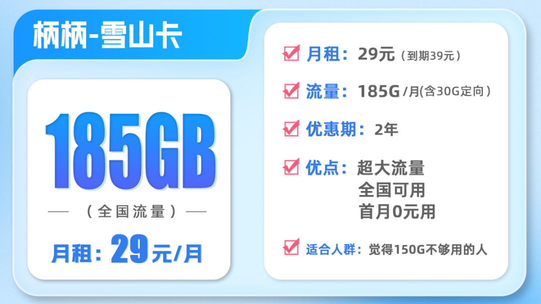 很多人求柄柄推荐大流量卡,这不来了,在如今59元15G套餐遍地走的情况下,29元就可享185G,一张卡用出两张流量卡效果,直接省一半的钱。