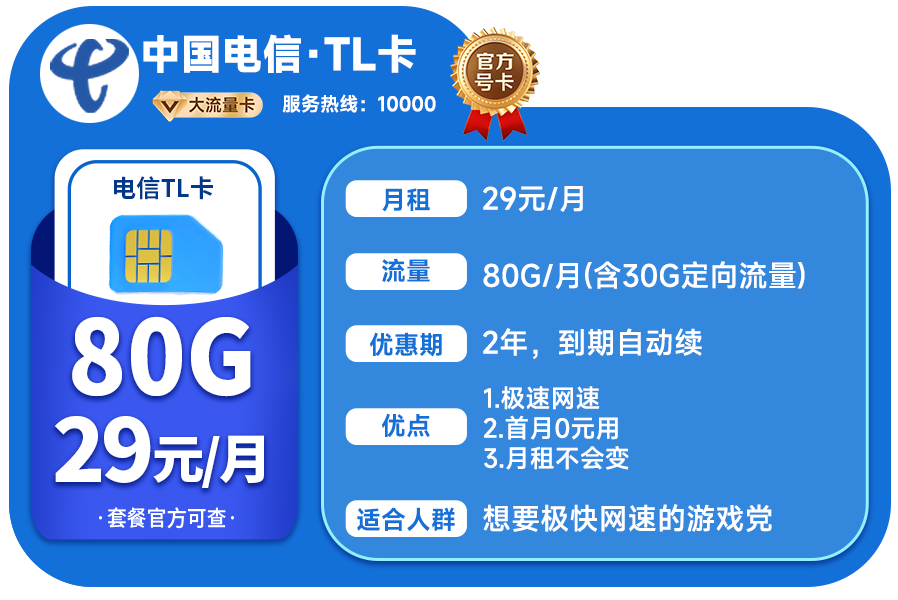 如果每月只用大几十G,就想办张最划算的卡,那必选电信TL卡,29元80G,月租不变,流量包每2年一续。