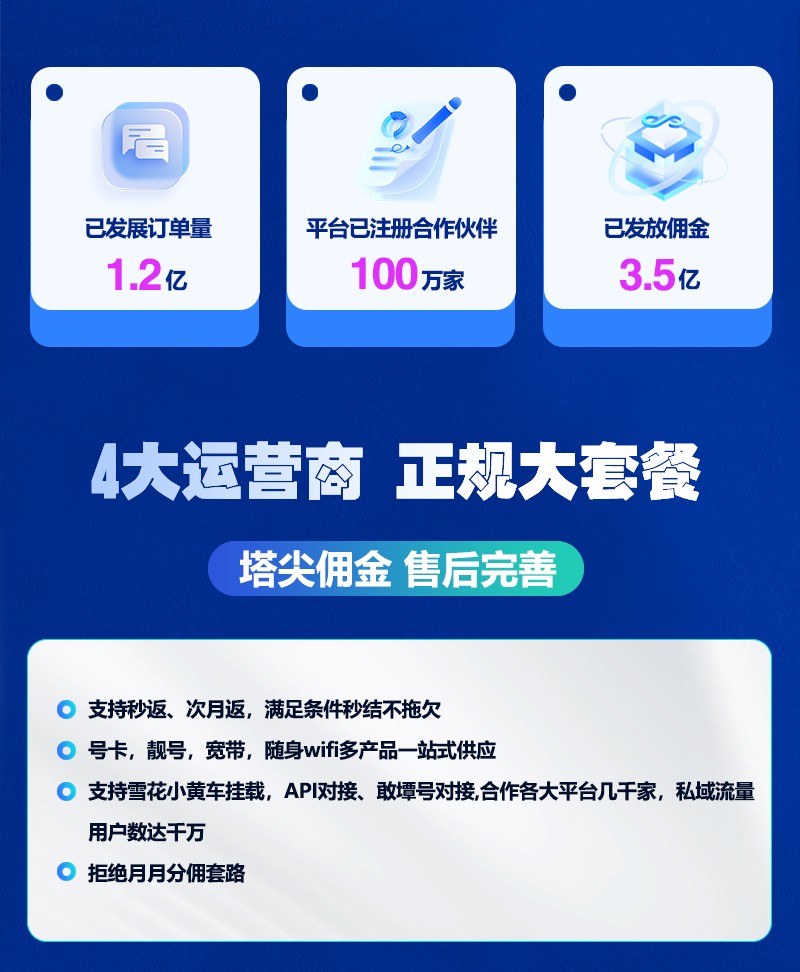 携手172号卡平台,共创运营商合作新篇章 导语:在激烈的市场竞争中,携手合作伙伴共谋发展已成为企业制胜的关键。作为国内领先的通信服务提供商,172号卡平台凭借其卓越的分销能力,为广大运营商提供了