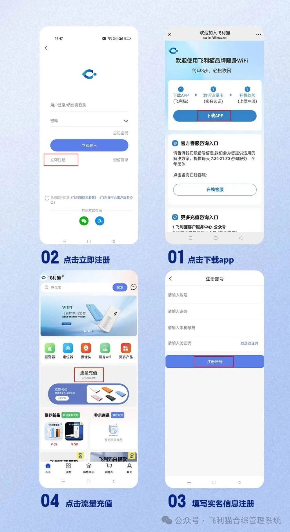 飞利猫综合管理平台注册和登录方式飞利猫综合管理平台电脑端使用步骤一、首页——您的飞利猫随身WiFi数据大屏商城-销售统计充值-套餐统计设备统计快捷模块知识库-常见问题二、WiFi设备——综合管理您的设